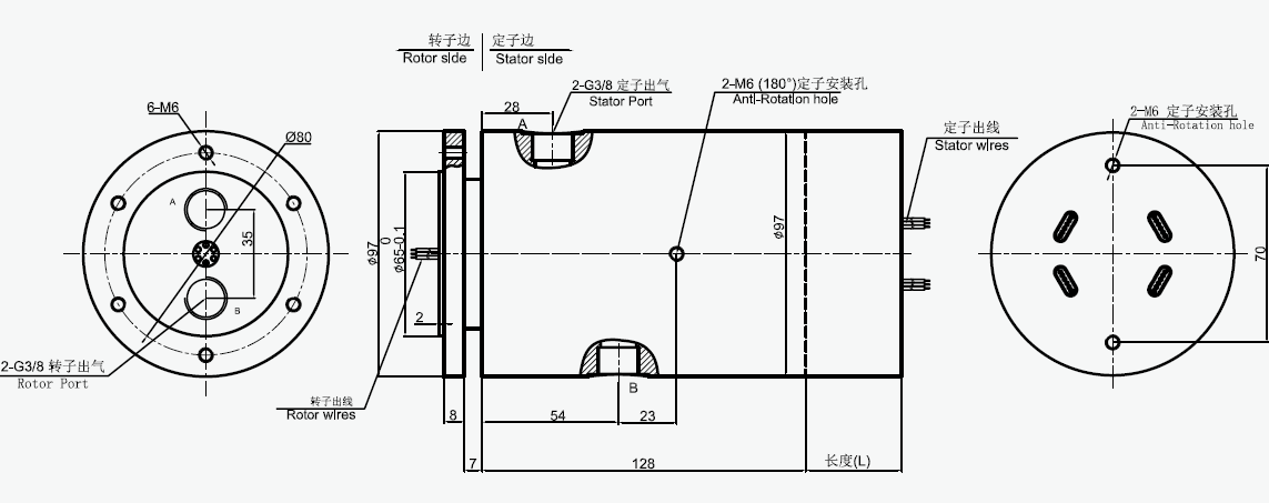 MAPH200-XX 气液电一体滑环选型表 1)XX=01,接口尺寸=M5, 气管规格3~6mm 2)XX=02,接口尺寸=G1/8,气管规格3~10mm 3)XX=03,接口尺寸=G1/4,气管规格3~12mm 4)XX=04,接口尺寸=G3/8,气管规格3~16mm 5)XX=05,接口尺寸=G1/2,气管规格3~20mm |